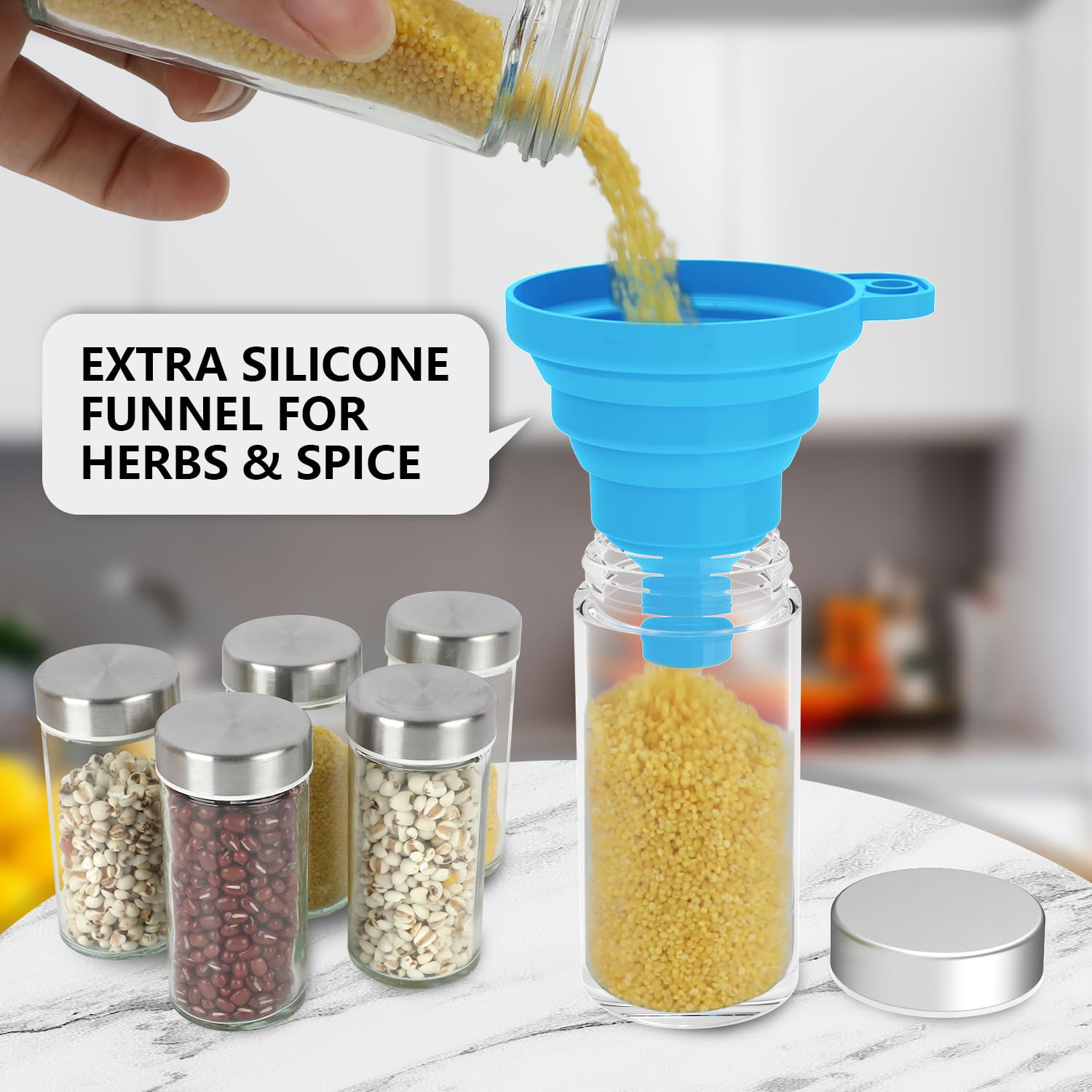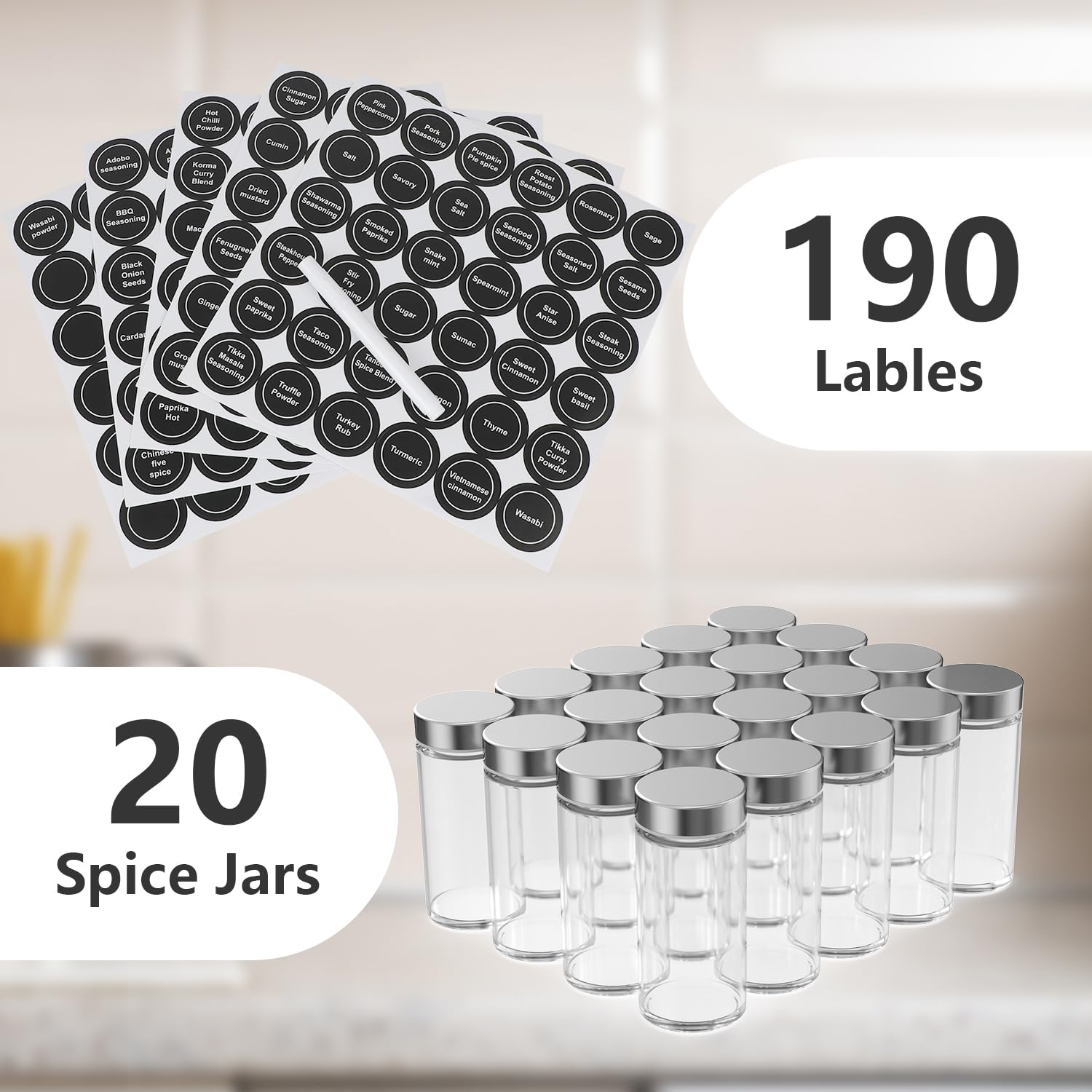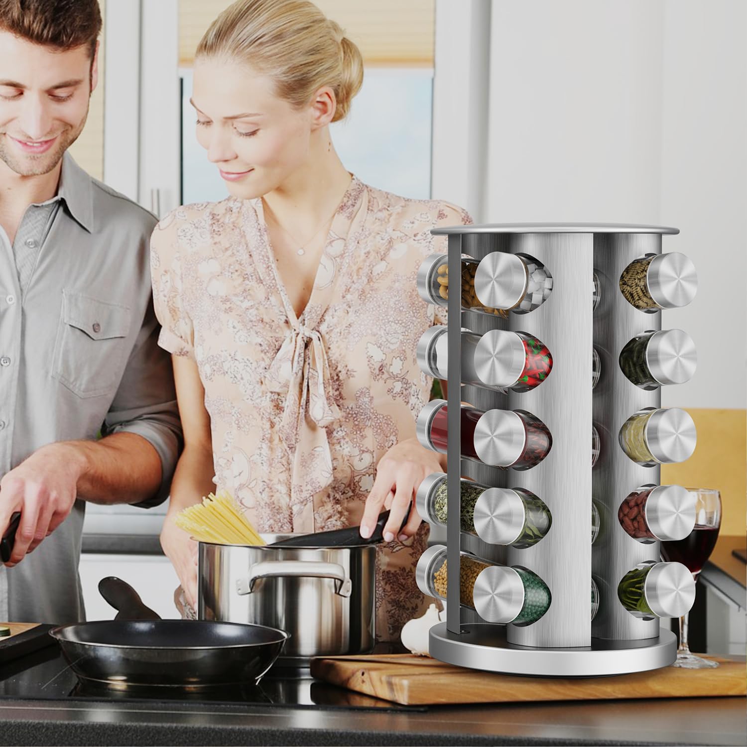 Especiero compacto y duradero de acero inoxidable con capacidad para 20 frascos, rotación de 360°, 144 etiquetas incluidas y diseño elegante para cocina u hogar.
