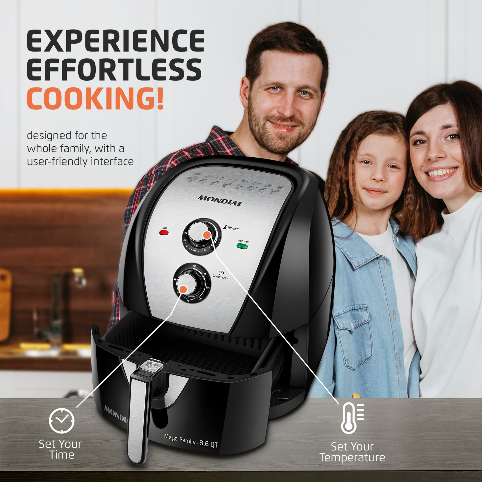 Freidora de aire familiar con capacidad de 8.6 QT, 2 controles giratorios fáciles de usar, potencia de 1800 W y construcción en acero inoxidable para cocinar rápido, sano y seguro.